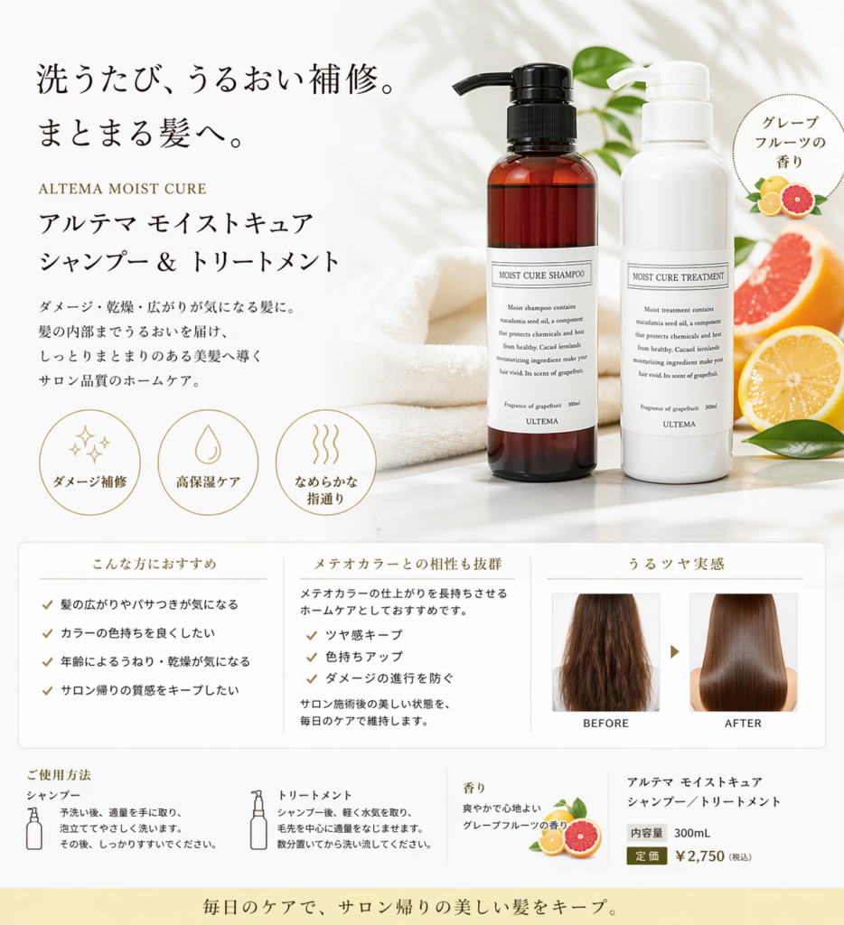 アルテマモイストキュアシャンプー・トリートメント 2026.04.23 取扱い商品 Ahnyhairの営業でも使用していますシリーズになります。お髪に必要な成分で作られており、毛髪を強化して枝毛・切れ毛を防いでくれます。